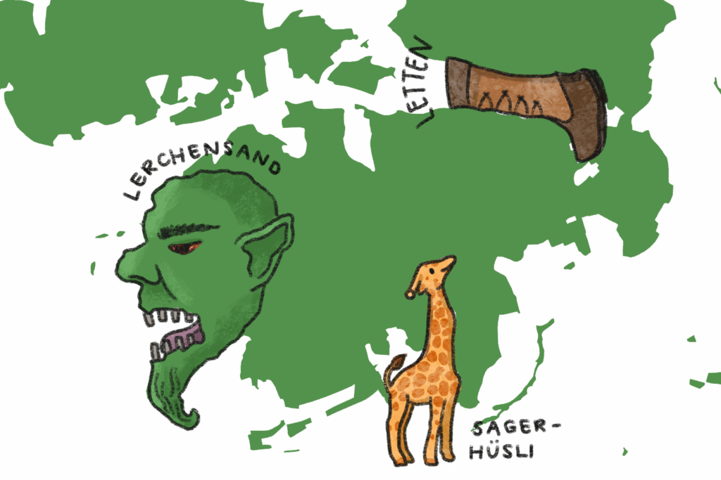 Pareidolie ist das psychologische Phänomen, bei dem das Gehirn in zufälligen Mustern oder Strukturen vertraute Formen wie Gesichter, Tiere oder andere Dinge erkennt. Statt in den Wolken am Himmel suchen die Schülerinnen und Schüler in Gewässer- oder Waldkarten nach Figuren und gestalten diese mit verschiedenen Techniken aus. So machen sie sichtbar für alle, was zunächst nur sie sehen, etwa die Giraffe über dem Sägerhüsli.