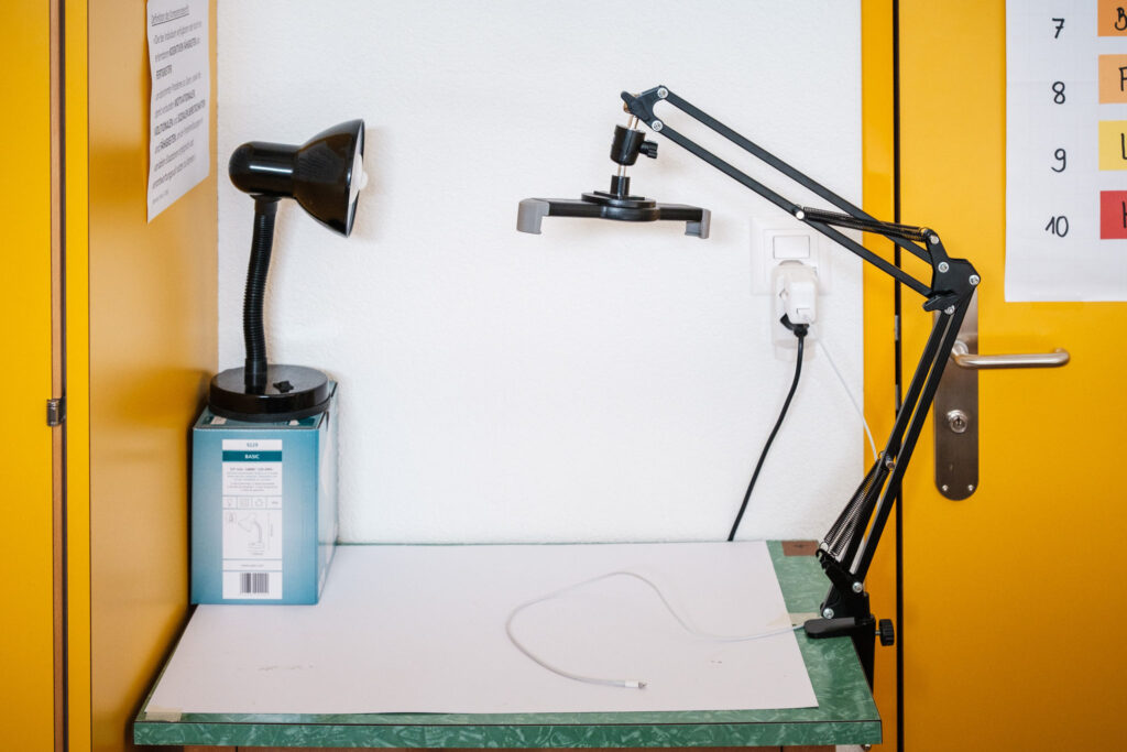 Smartphone oder Tablet eignen sich besonders gut für die Filmaufnahmen. Die Geräte sollten so platziert werden, dass die gewünschte Einstellung (gemäss Drehbuch) gewählt werden kann und die Aufnahmen nicht verwackeln.