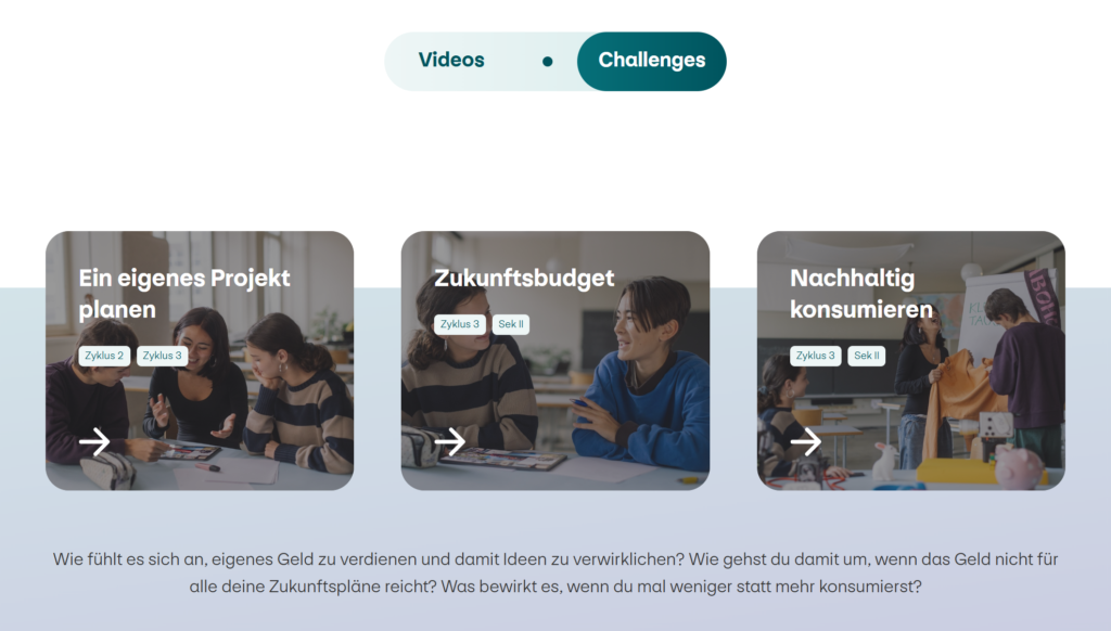 In der Challenge «Ein eigenes Projekt planen», budgetieren und dokumentieren die Schüler:innen in Gruppen Schritt für Schritt ein Klassenprojekt, sodass dieses erfolgreich umgesetzt werden könnte. Oder sie befassen sich in der Challenge «Zukunftsbudget» mit ihren persönlichen Zukunftsvorstellungen und Wünschen und erstellen eine realistische Finanzplanung.