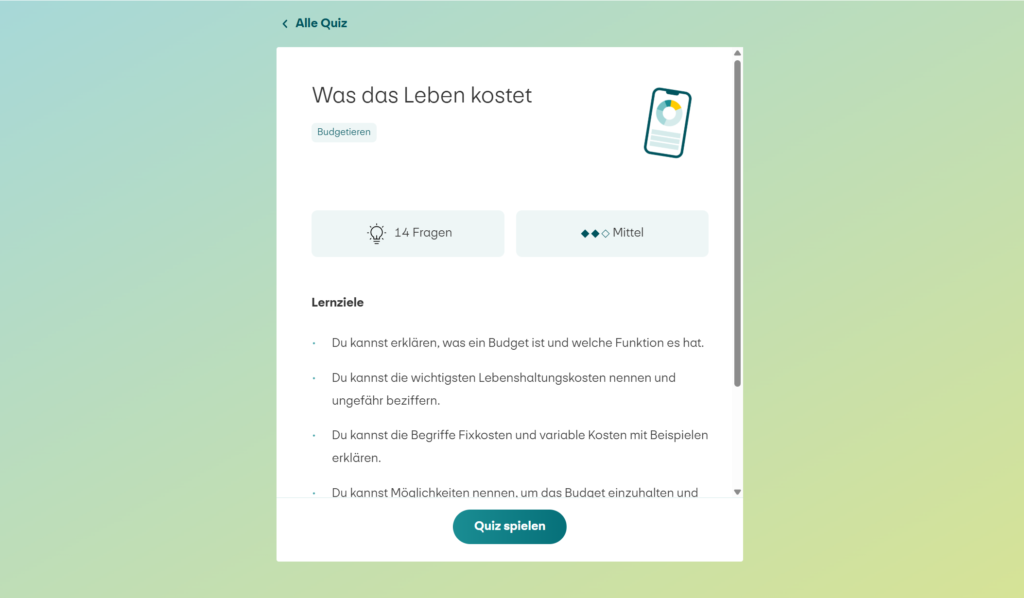 Im Quiz «Was das Leben kostet» testen die Schüler:innen ihr Wissen rund ums Budgetieren.